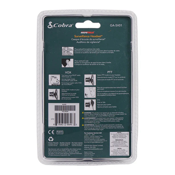 Part numbers GA-SV01 and GA-SV01 2P:3.5mm plug style. Compatible with all Cobra FRS radios with standard non-threaded 3.5mm headphone socket including PX650, ACXT Series, RX Series, and TrailBlazer Series.